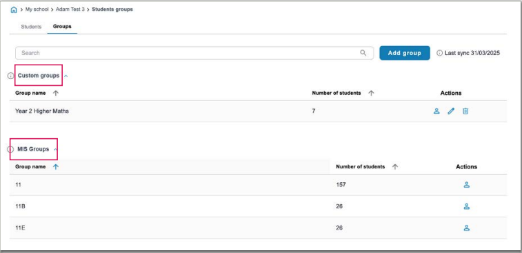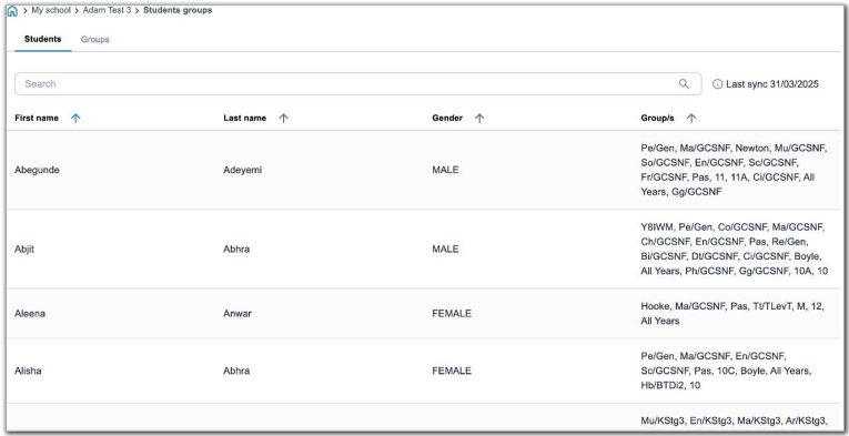 Students are imported from your MIS. Each student shows the groups they’re currently allocated to.